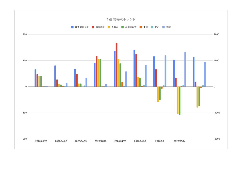 なお、検査実施人数は右の縦軸を使っていますので他のパラメーターとスケールが10倍異なる点にご注意下さい。