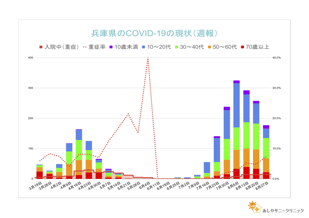 新規発症は順調に減少中ですが、リスクが上昇する50歳以上も減少に転じたため追って重症者や死亡者もピークアウトすると予想されます。一方、10歳未満は7/30以降、10名前後で推移し続けているのが気になるところです。