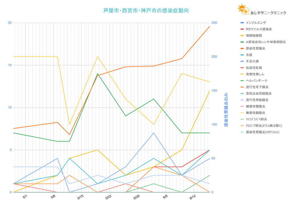 またまだ絶対数は少ないもののRSウイルス感染症も増加傾向です。昨年季節外れの初夏に大流行したのは記憶に新しく、今後の動向に要留意です。
