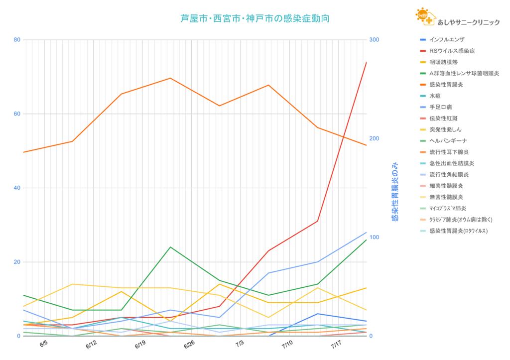 兵庫県感染症情報センターからリリースされている週報から芦屋市・西宮市・神戸市の情報をピックアップして集計したものと、兵庫県のCOVID-19関連のデータを集計したものを配信しています。