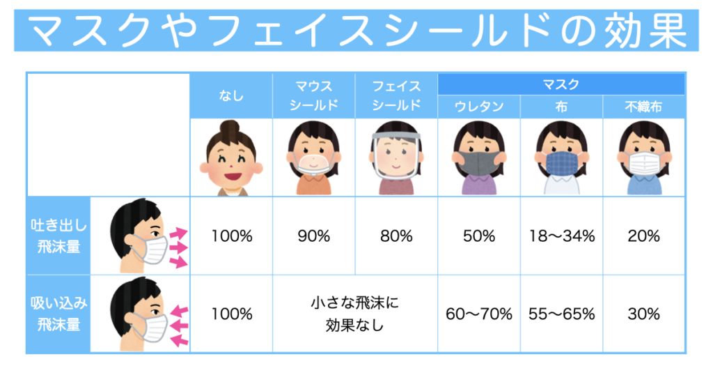 材質や装着状況でウイルス減少効果に差はありますが、現時点でマスク着用は合理的な感染対策だと思われます。