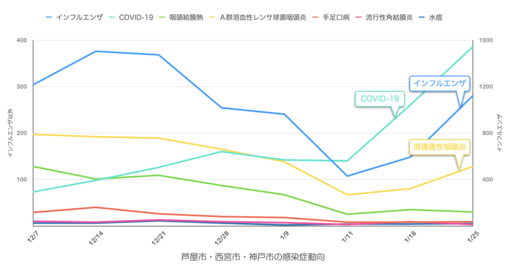 兵庫県感染症情報センターからリリースされている週報から芦屋市・西宮市・神戸市の情報をピックアップして集計したものを若干のコメントをつけて配信しています。
