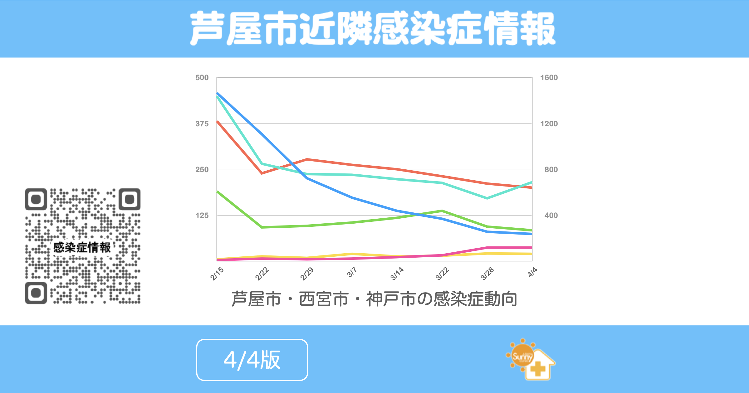 兵庫県感染症情報センターからリリースされている週報から芦屋市・西宮市・神戸市の情報をピックアップして集計したものを若干のコメントをつけて配信しています。
