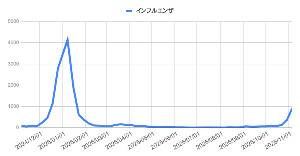 - 中期的には、2025年初頭にやや多く、春以降は低水準で推移していましたが、秋に入ってから散発的な増加が繰り返されています。