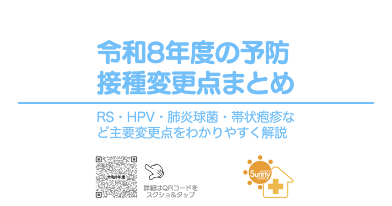 令和8年度の予防接種制度の変更点を分かりやすく解説します。RSウイルスワクチンの新規導入、HPVワクチンの9価化、高齢者肺炎球菌ワクチンの変更、帯状疱疹ワクチン制度の見直しなど、芦屋市で接種を検討中の方へご案内します。